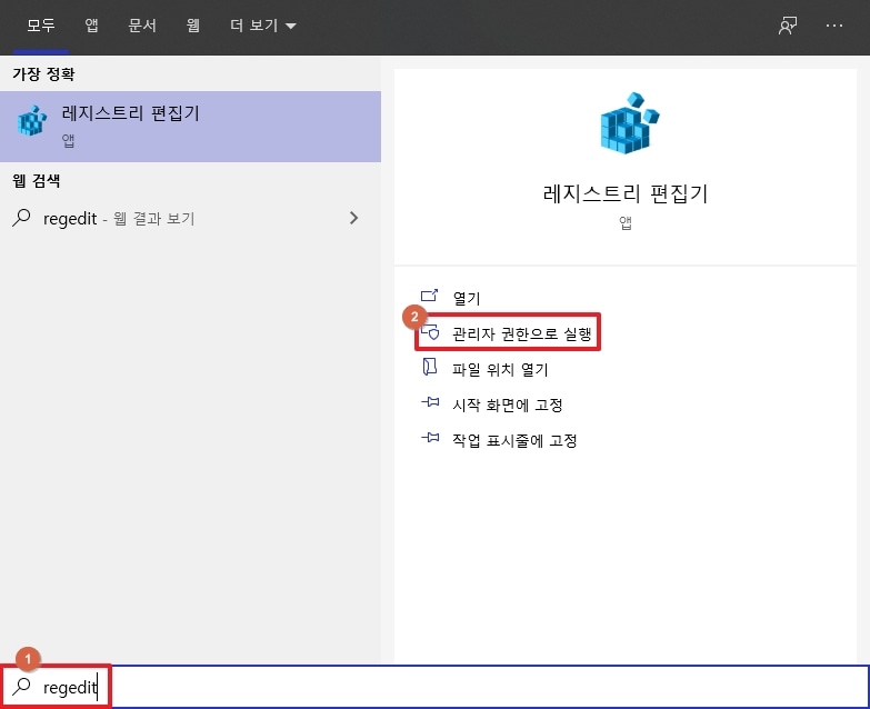 어도비 플래시 플레이어 관련 레지스트리가 남아있기 때문에 완벽하게 삭제하기 위해서는 어도비 플래시 플레이어 관련 레지스트리 또한 삭제해야 합니다. 좌측 하단 검색에 "regedit"를 입력하고 관리자 권한으로 실행합니다.