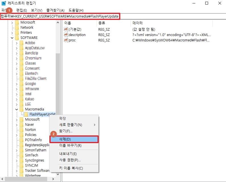 어도비 플래시 플레이어 관련 레지스트리를 위 이미지와 같이 모두 삭제합니다.
