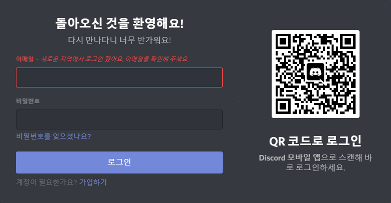 위 이미지와 같이 "이메일 - 새로운 지역에서 로그인 했어요. 이메일을 확인해 주세요." 라는 문구와 함께 로그인이 되지 않을 경우 디스코드 로그인 오류라고 볼 수 있습니다. 로그인 오류가 발생하는 원인으로는 최근 접속했던 디스코드 지역 IP와 현재 접속한 지역 IP가 다를 경우 발생합니다.