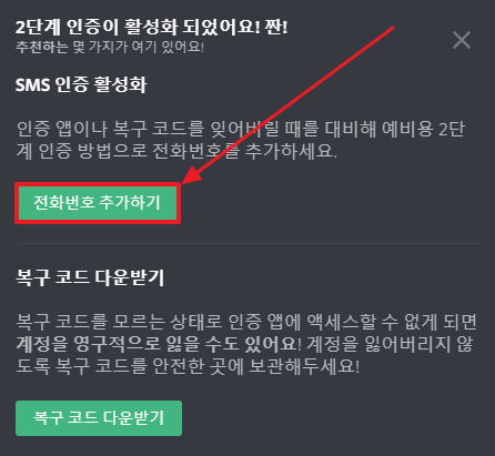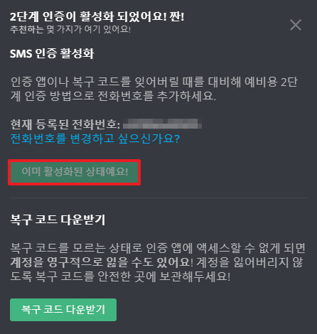 위 이미지와 같이 이미 활성화된 상태예요! 문구가 나온다면 성공적으로 디스코드 SMS 인증까지 활성화된 상태를 의미합니다. 디스코드 복구 코드까지 다운로드 하면 더욱 강력한 보안이 될 수 있지만 선택 사항이므로 하지 않았습니다. SMS 인증까지 활성화된 것으로 충분히 높은 디스코드 계정 보안을 유지할 수 있습니다.