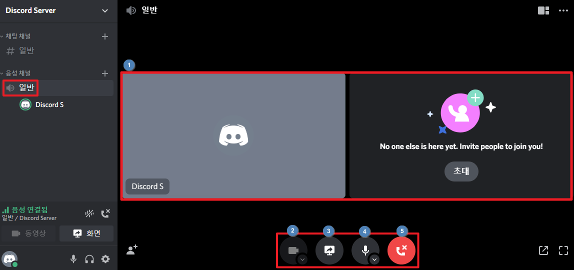 서버에 접속하고 음성 채널에 접속하게되면 위 이미지처럼 보이는 것이 음성 채널의 전체적인 화면입니다.