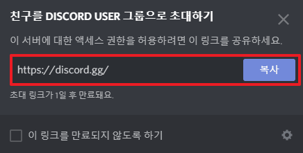 서버를 생성하면 친구에게 메시지로 초대 링크를 보낼 수 있습니다. 카카오톡이나 여러 메신저 등 텍스트를 통해 보낼 수 있다면 어디든 초대 링크를 보내 서버에 초대할 수 있습니다.