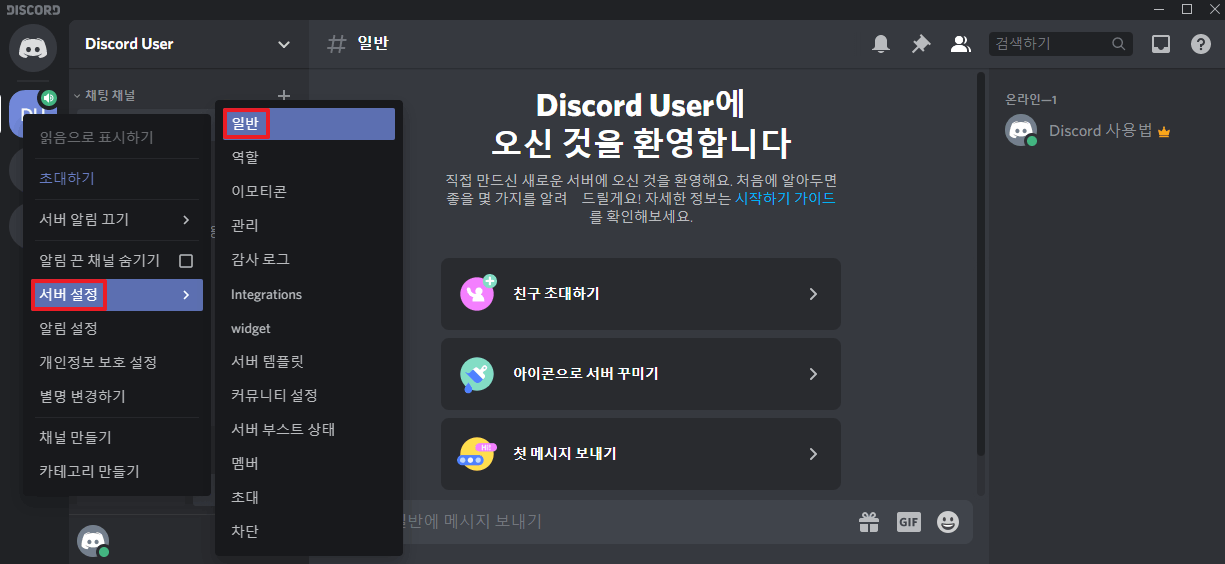 먼저 삭제하고싶은 서버를 우클릭해 서버 메뉴를 열고 서버 설정에서 일반 메뉴에 들어갑니다. 일반 메뉴에는 디스코드 서버 내의 유저들의 기본적인 역할이나 서버 접속 제한 등을 관리할 수 있습니다.
