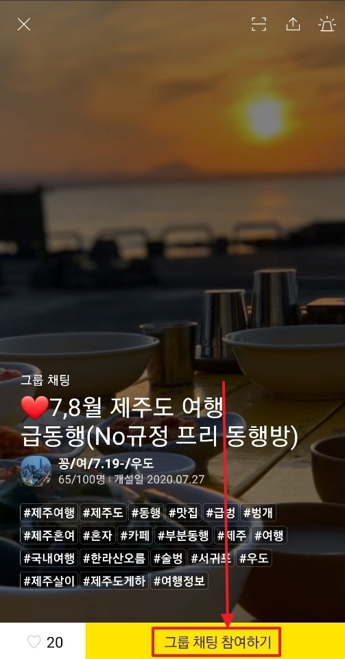 예시로 제주도 맛집을 검색했습니다. 간략한 오픈채팅방 소개를 보고 원하는 오픈 채팅방이 있다면 참여합니다. 예시는 제주도 맛집과 관련된 정보를 공유하는 오픈 채팅방에 참여합니다.