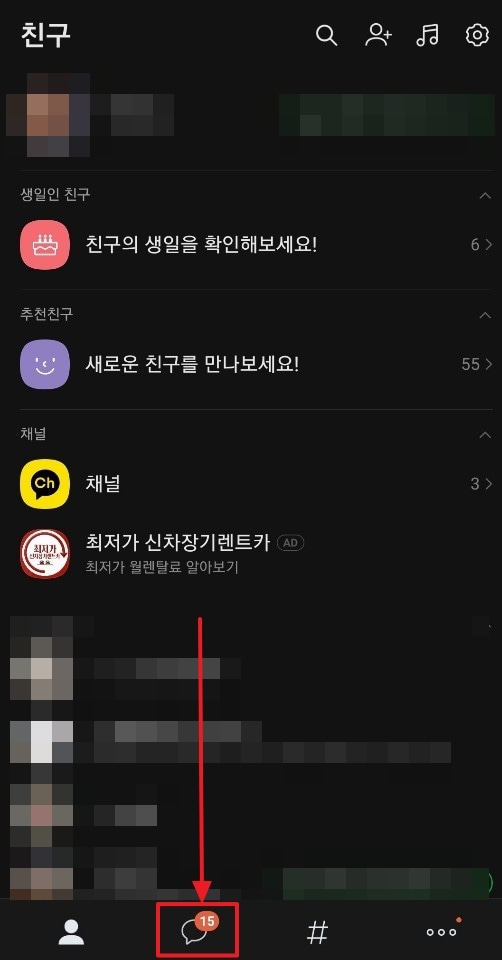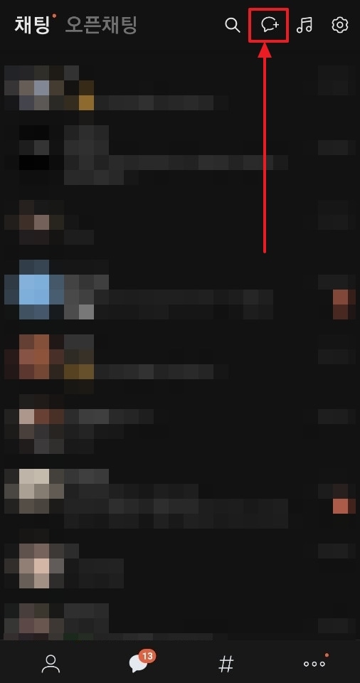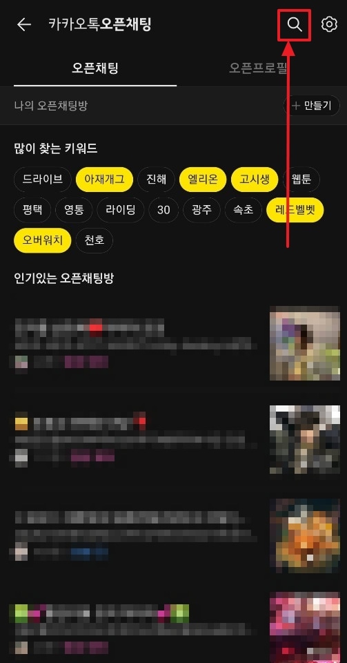 우측 상단에 오픈 채팅을 클릭하고 다시 우측 상단에 돋보기 버튼(검색 버튼)을 클릭합니다.